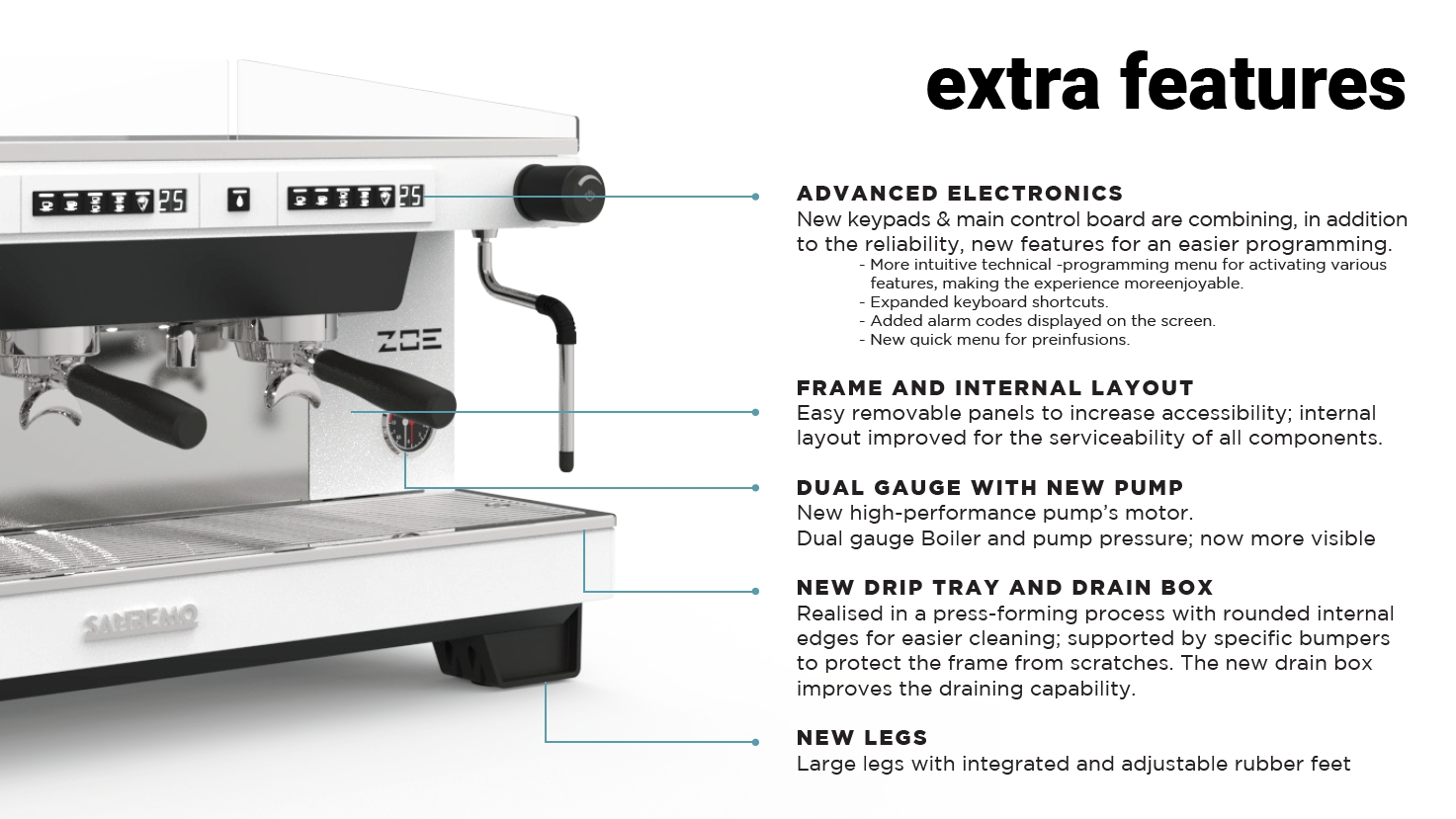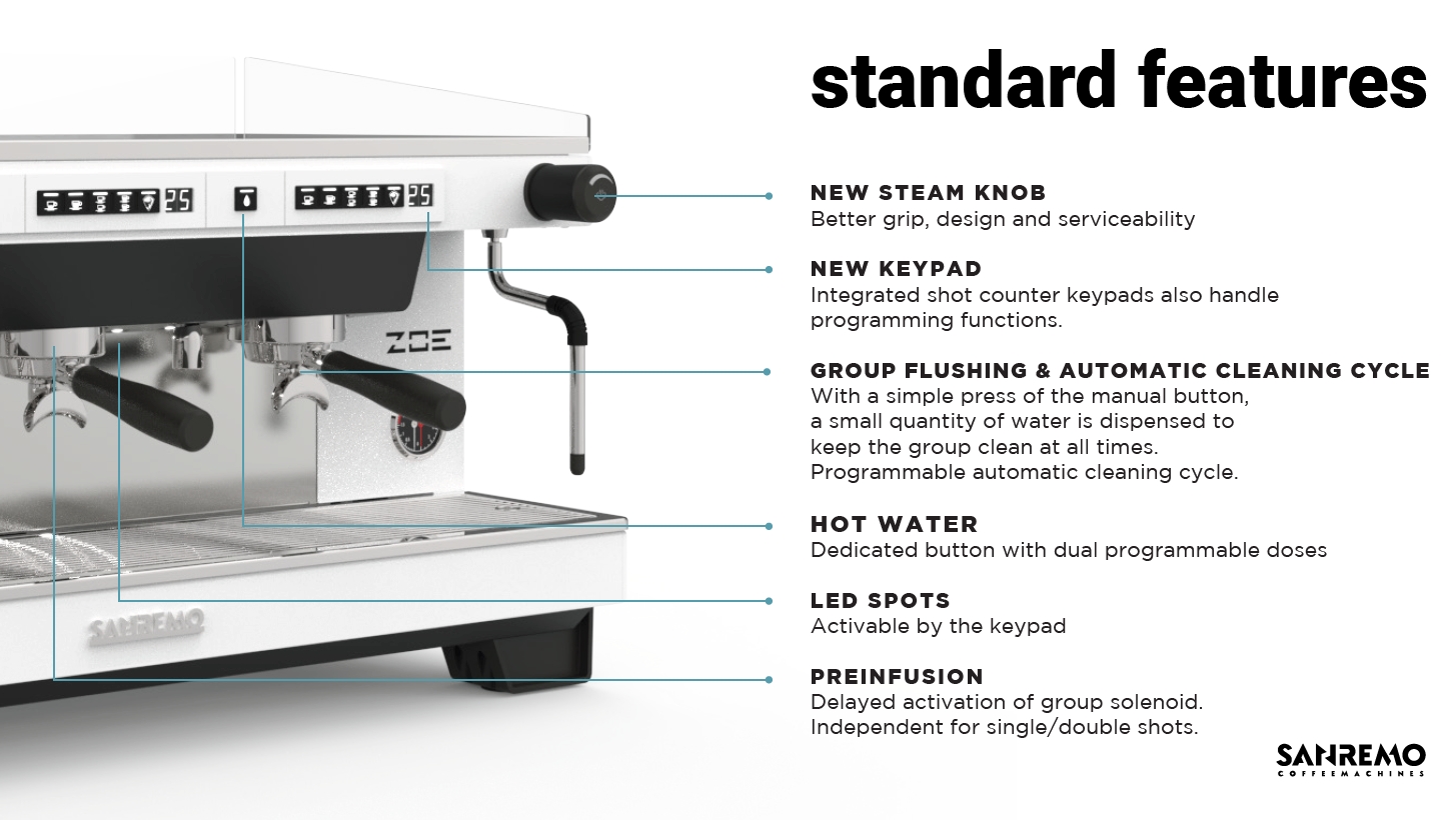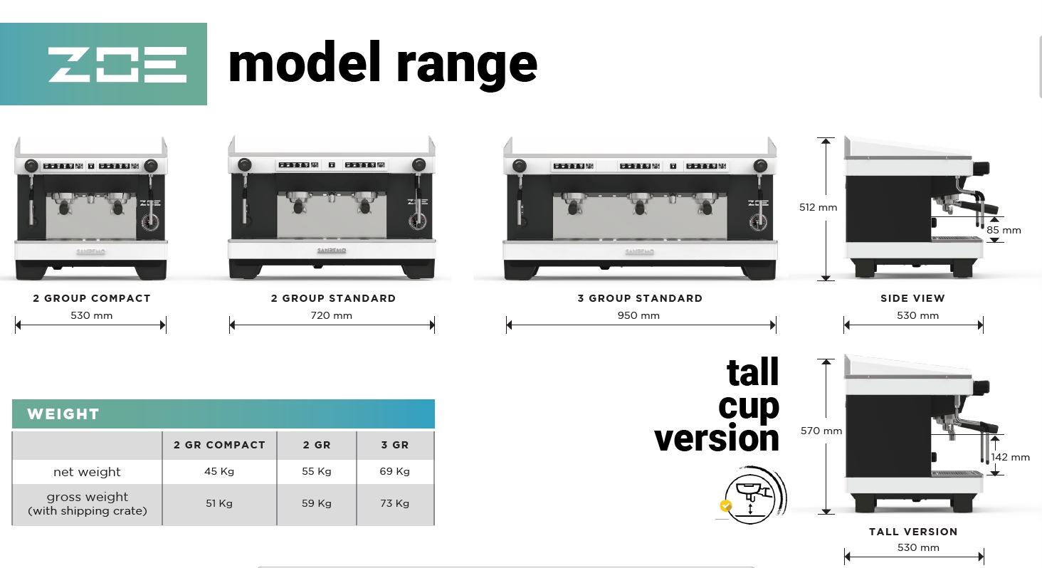 Nova generacija Zoe Compact modela donosi moderan minimalistički dizajn s ravnim postoljem bez klasičnih nogica s inovativnim podešavanjem, poboljšanu elektroniku i još stabilniju kontrolu temperature. Rezultat je pouzdan profesionalni aparat koji pruža konstantnu kvalitetu espressa uz jednostavno rukovanje i dugotrajnost u svakodnevnom radu.