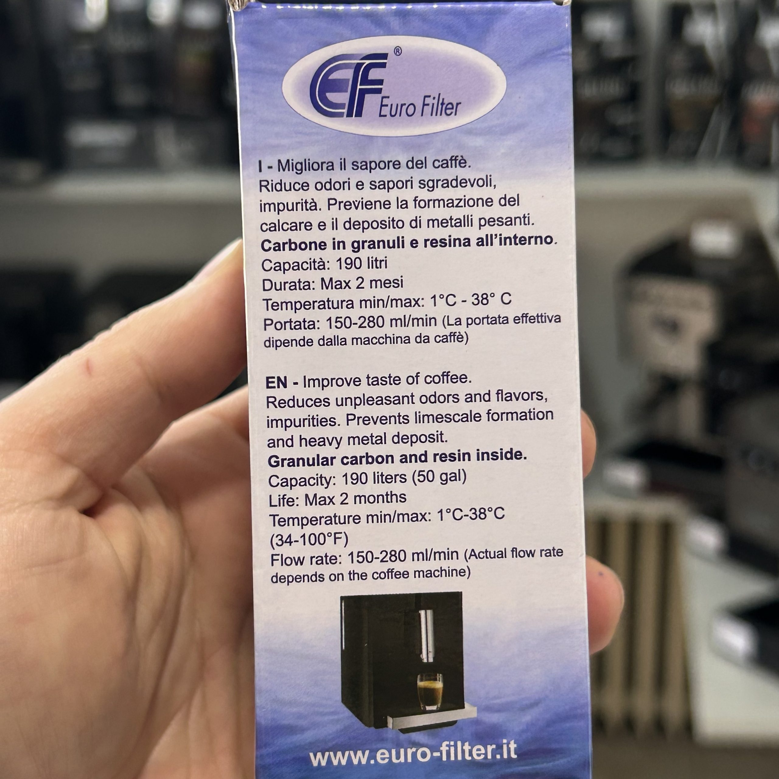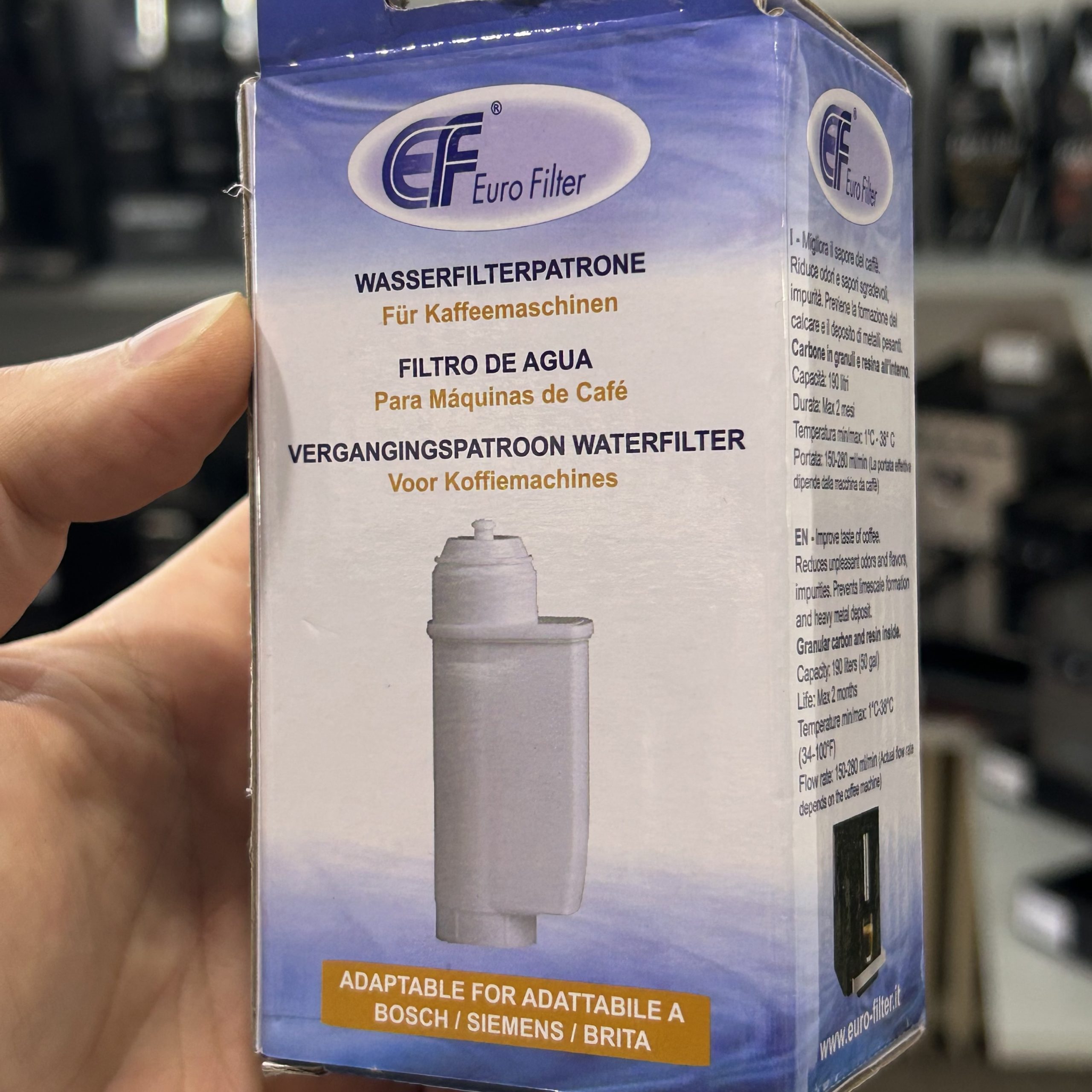 Filter vode Euro Filter namijenjen je za korištenje u aparatima za kavu kako bi se poboljšala kvaliteta vode i osigurao bolji okus kave. Uklanja nečistoće, klor i neželjene mirise iz vode te smanjuje stvaranje kamenca u aparatu.
