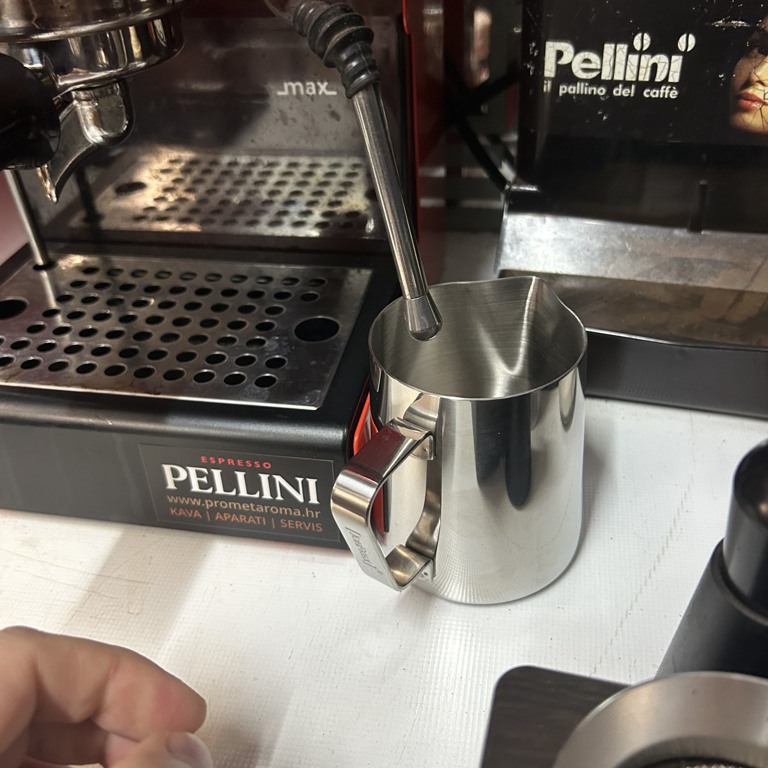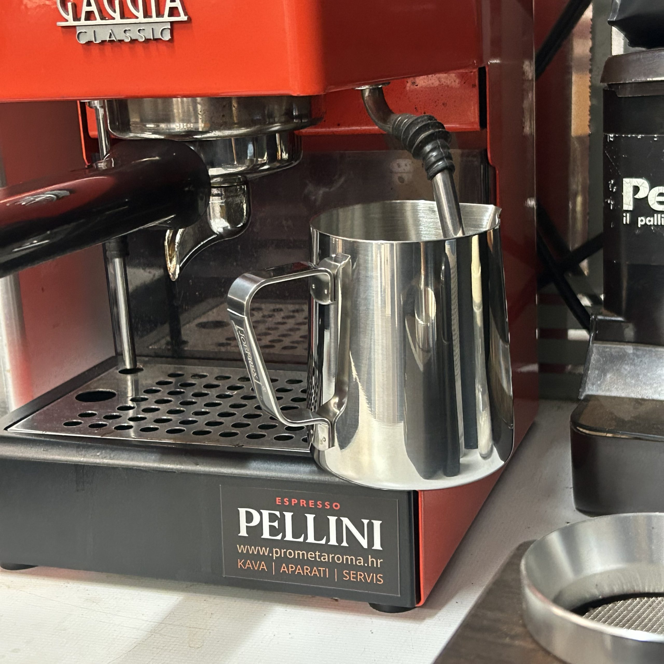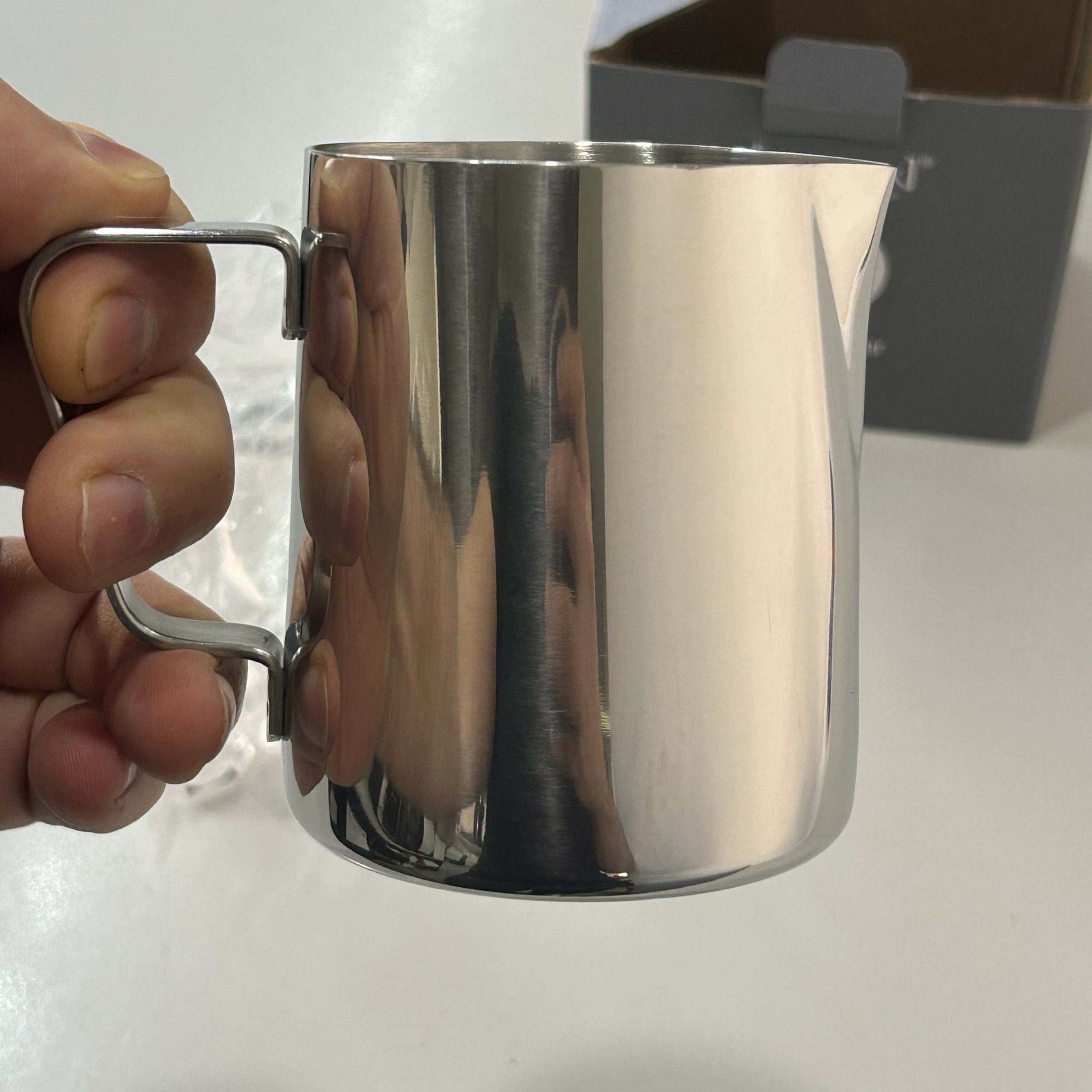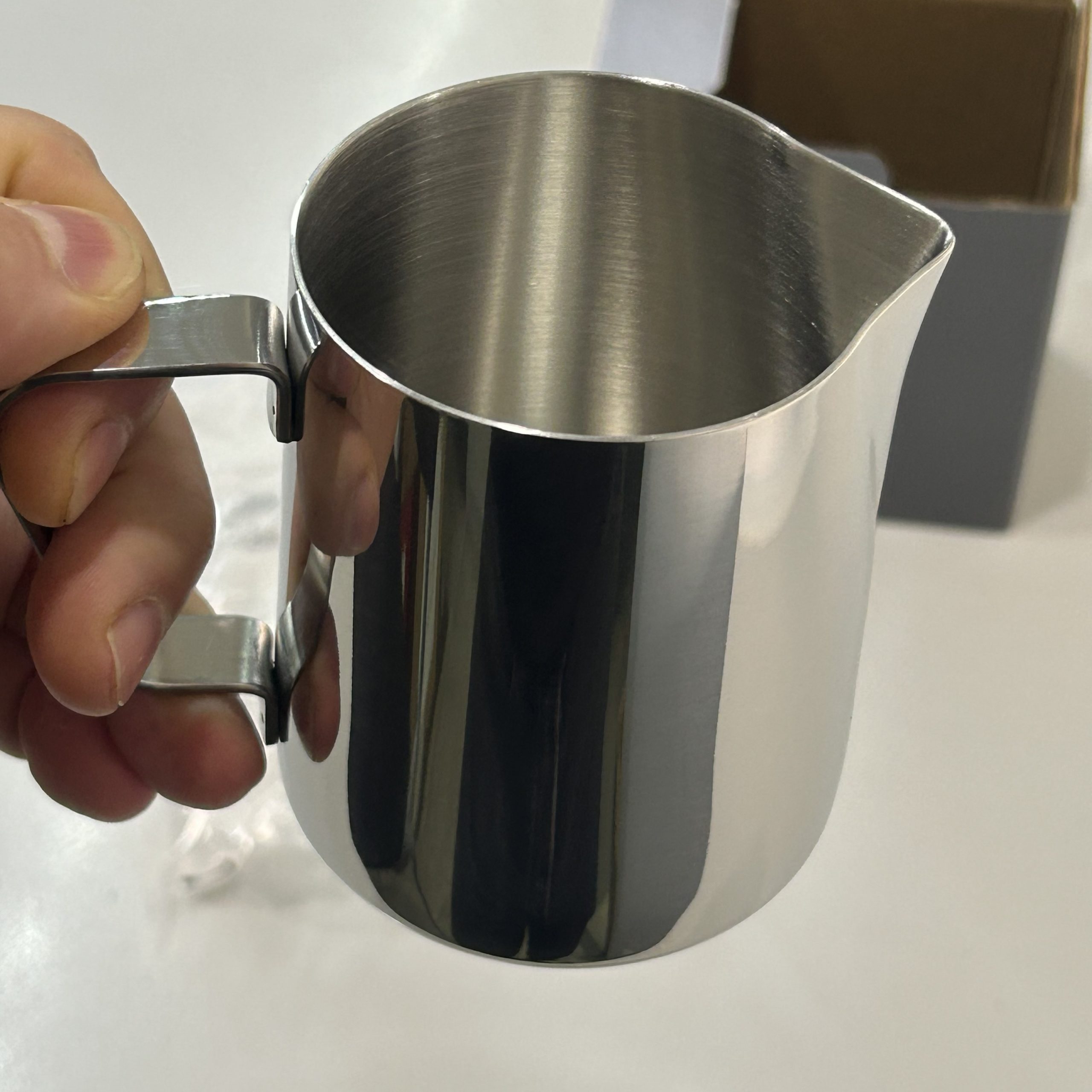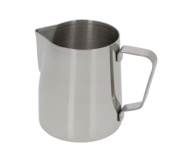 Posuda ima ergonomsku dršku i široki izljev, što omogućuje lakše točenje i preciznije oblikovanje mliječne pjene.