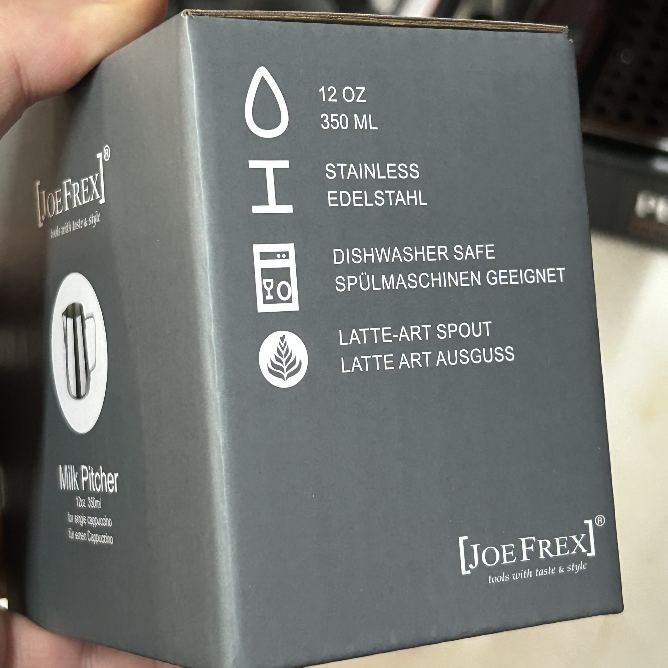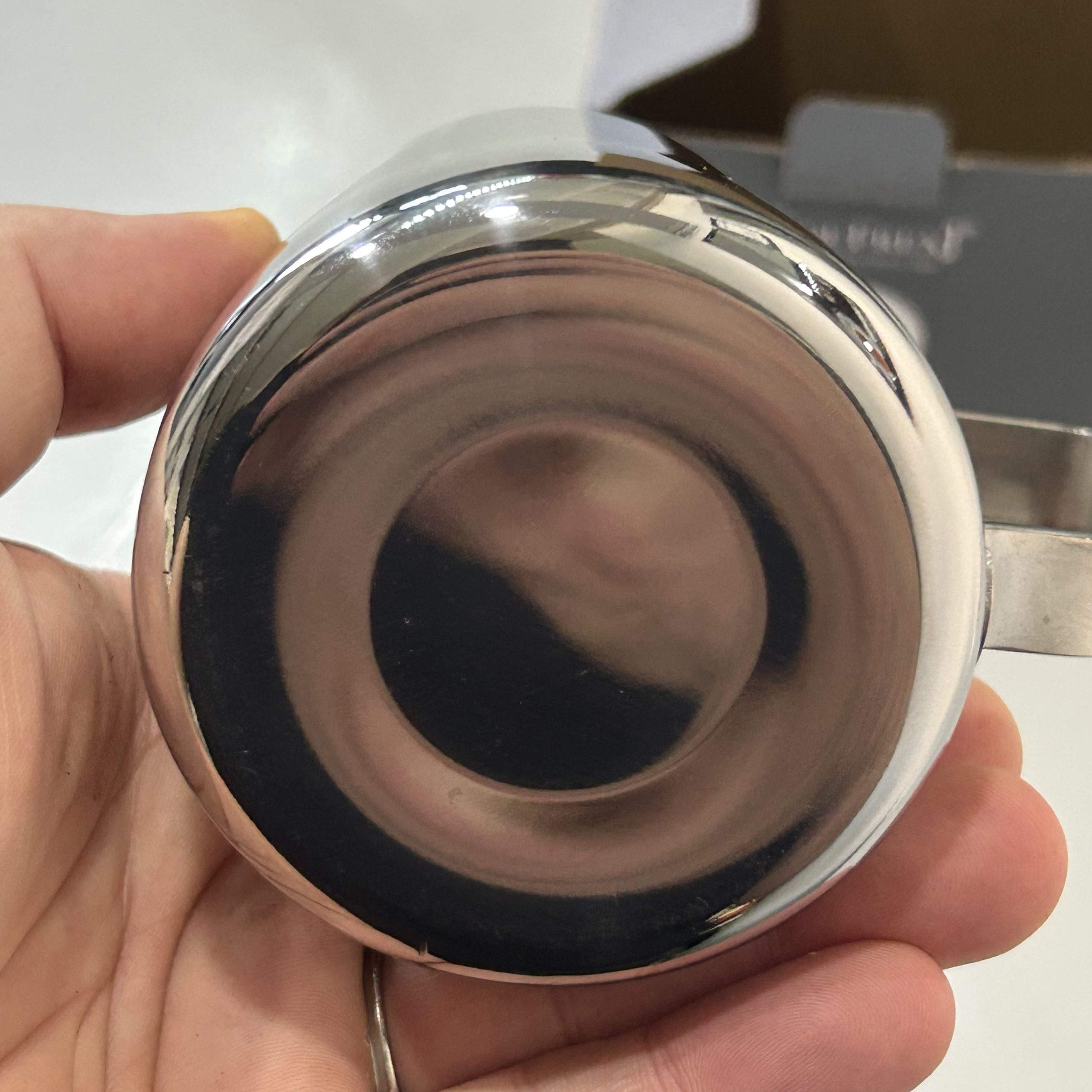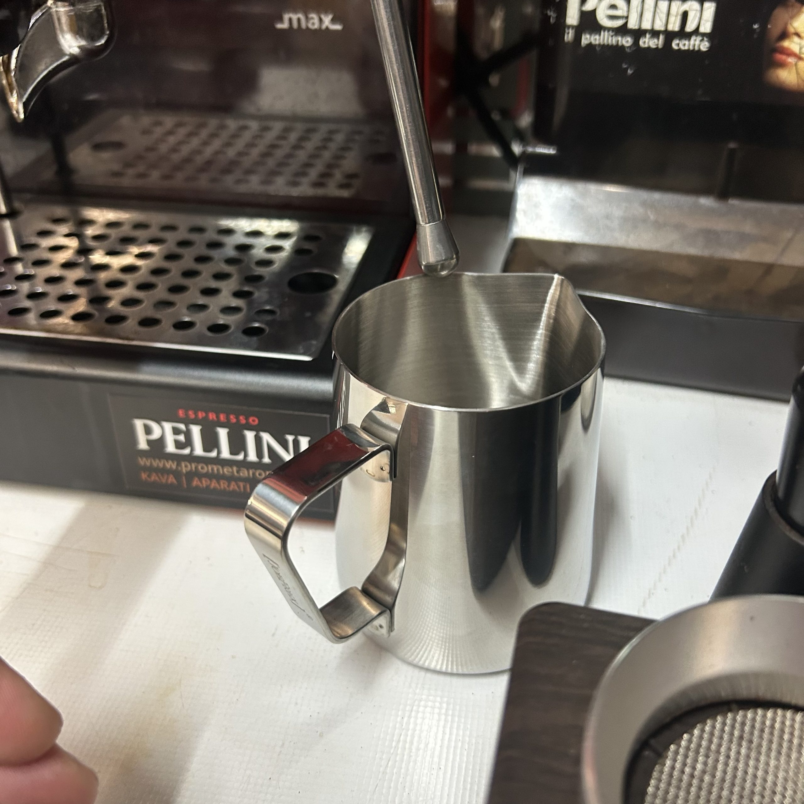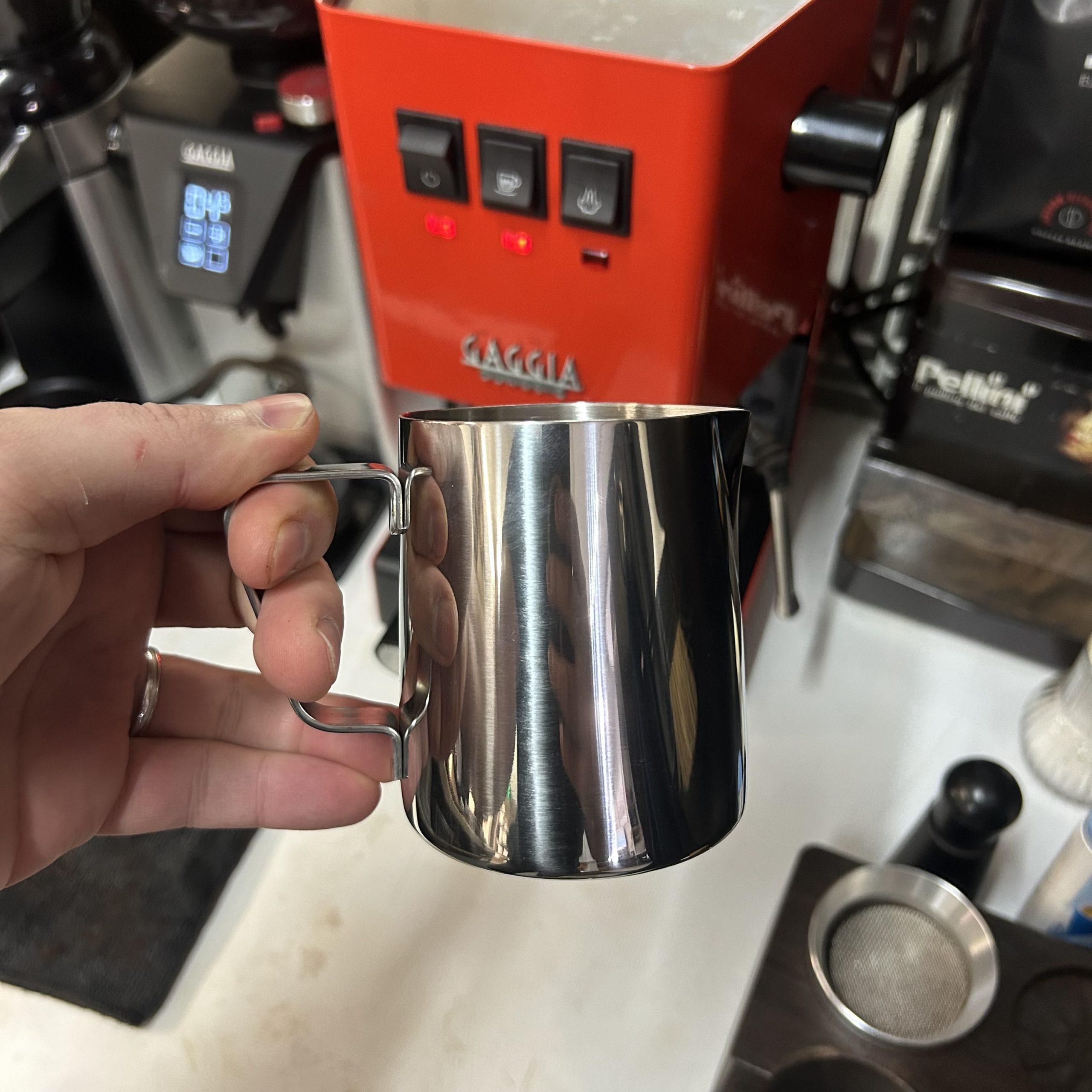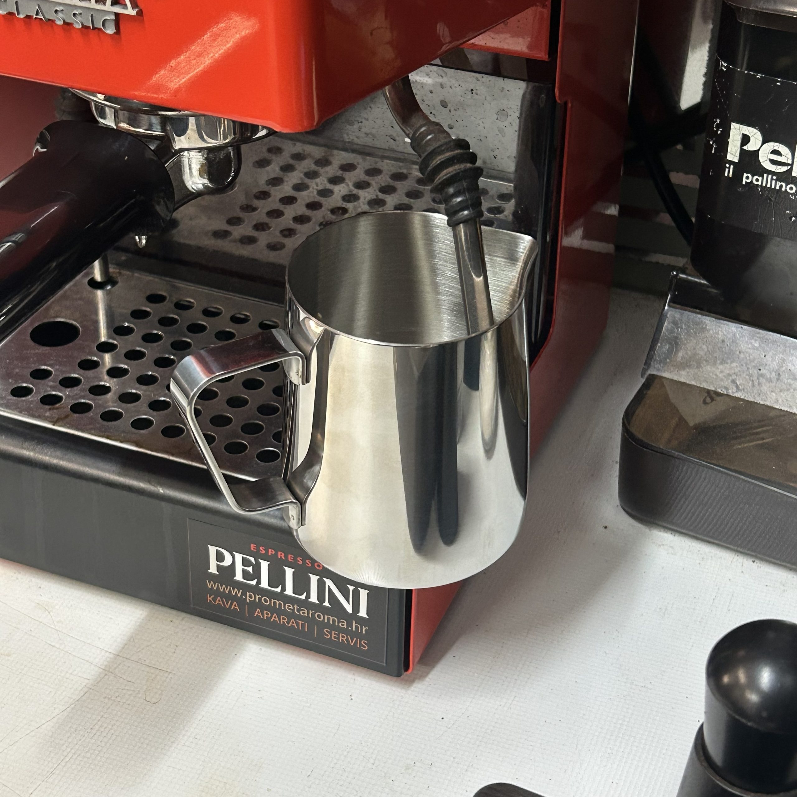 Posuda ima ergonomsku dršku i široki izljev, što omogućuje lakše točenje i preciznije oblikovanje mliječne pjene.