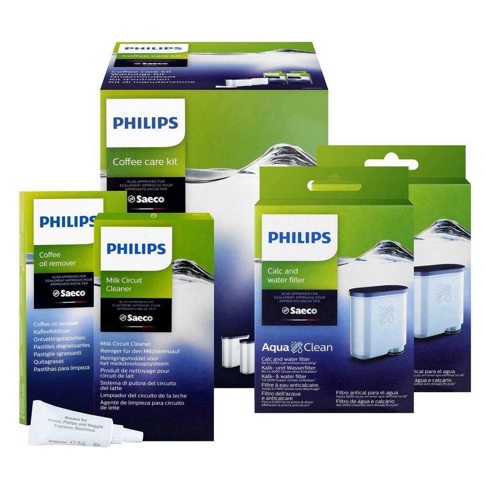 Philips CA6707/10 komplet uključuje AquaClean filtere, tablete za uklanjanje ulja, sredstvo za čišćenje mliječnog sustava i mast za podmazivanje, čime osigurava dugotrajan rad i vrhunsku kvalitetu kave.